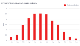 I Norge har vi en periode med mye sol fra midten av mars til september. Dette gir en god effekt på strømproduksjonen, og det er her vi tjener inn mesteparten av investeringen. Selvom det er lite lys i vintermånedene vil vi få en dobbel effekt ved at vi får strømproduksjon via direkte sollys og refleksjon fra snøen. I den mørkest tiden av året, november, desember og januar, vil det naturligvis være en god del lavere produksjon, men det er produksjon nok til å redusere strømregningene. Se grafen til den estimerte energiproduksjon pr. måned fra en av våre kunder lokalt her i Vestfold.